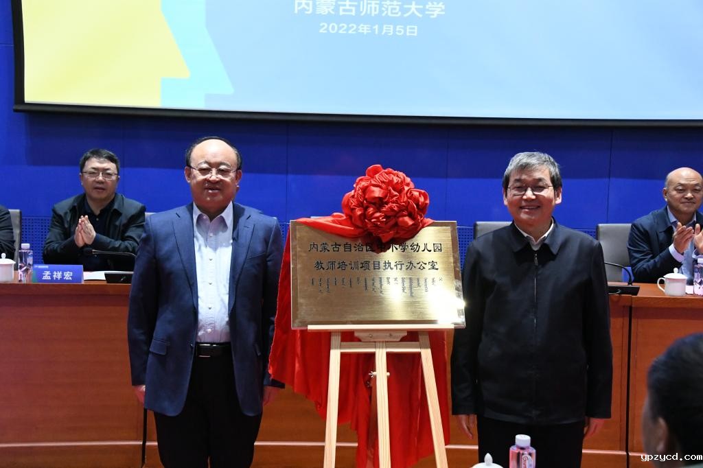 教育厅教师工作处处长武秀珍宣读了《关于成立内蒙古自治区中小学幼儿园教师培训项目执行办公室的通知》。自治区党委教育工委委员、教育厅党组成员、副厅长李占峰与我校党委书记阿拉坦仓教授共同为“项目办”揭牌。