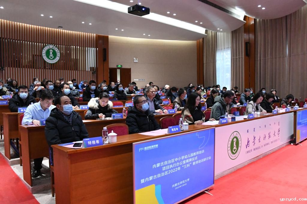 1月5日上午,内蒙古自治区中小学幼儿园教师培训项目执行办公室(以下简称“项目办”)揭牌仪式暨内蒙古自治区2022年“三科”教师培训研讨会在我校信息楼报告厅隆重举行。自治区党委教育工委委员、教育厅党组成员、副厅长李占峰,自治区教育厅教师工作处处长武秀珍、教研室主任孙柏军,内蒙古民族大学党委委员、副校长任军,包头师范学院党委委员、副校长王有亮,呼伦贝尔学院党委委员、副校长孟祥宏,赤峰学院、集宁师范学院继续教育学院负责同志,我校党委书记阿拉坦仓,副校长宫箭,各部门、各学院主要负责人以及继续教育学院全体教职工参加了会议。会议由我校党委委员、副校长张海峰主持。