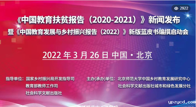 为贯彻落实以习近平同志为核心的党中央关于脱贫攻坚乡村振兴的系列重要指示精神,实现脱贫攻坚与乡村振兴相衔接,3月26日,在国家乡村振兴局开发指导司、教育部教师工作司、社科文献出版社的指导下,《中国教育扶贫报告(2020-2021)》新闻发布暨《中国教育发展与乡村振兴报告(2022)》新版蓝皮书编撰启动会在北京举行。国家乡村振兴局(原国务院扶贫办)党组成员司树杰,国务院参事、国家乡村振兴局友成基金会常务副理事长汤敏,社会科学文献出版社总编辑杨群,贵州省教育厅,山西教育厅副厅长侯文一,山东教育厅副厅长戴龙成分别在开幕式上致辞。北京师范大学教育学部部长朱旭东教授,新华网总裁助理、国家乡村振兴产业发展协作平台(筹备)总负责人姚予疆,中国乡村教育发展研究中心执行主任李兴洲,中国乡村教育发展研究中心助理主任龚东卫,北京大学贫困地区发展研究院院长雷明,北京教科院终身学习与可持续发展研究所所长史枫,国家乡村振兴局友成基金会众扶教育专项基金副秘书长、北京微孝暖夕慈善基金会执行秘书长郑永杰出席北京主会场会议。