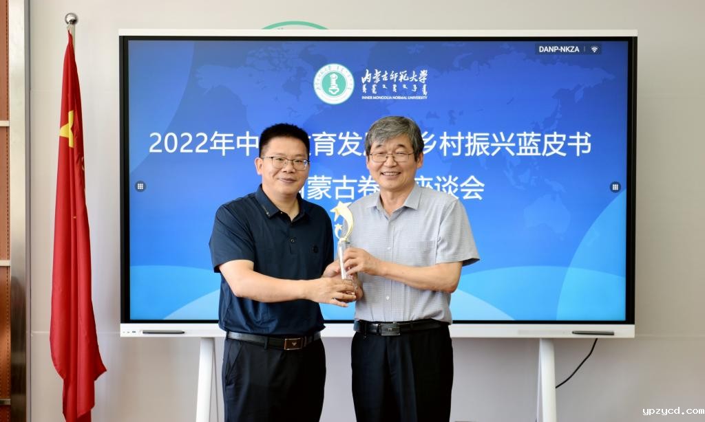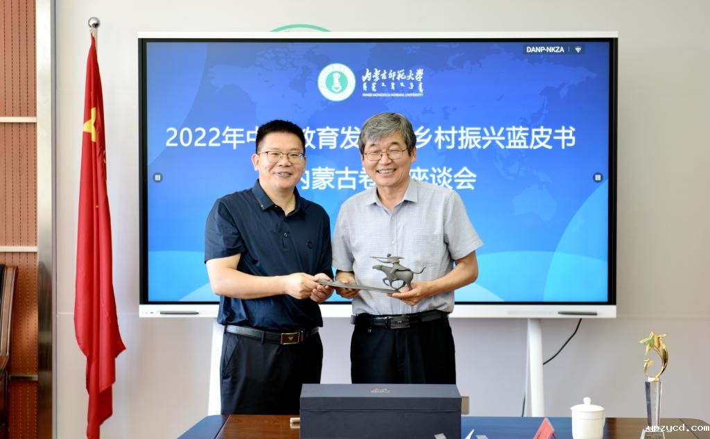 龚东卫为阿拉坦仓颁发了《中国教育扶贫报告(2020-2021)蓝皮书》编写单位优秀组织奖。阿拉坦仓为龚东卫赠送了校庆纪念品。