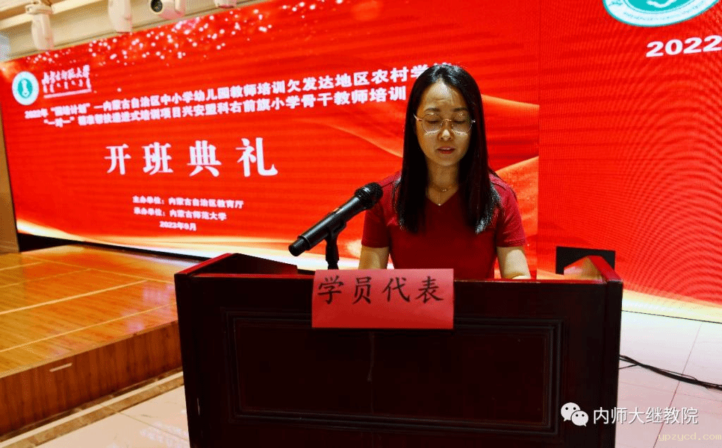 科右前旗第二小学教师李晓杰代表全体学员表态发言,表示一定严格遵守培训纪律和要求,积极投入学习,认真总结反思,努力把本次培训所学内化于心,外化于行,及时转化到实践教学中,不断提升自己的教育教学水平和专业能力。