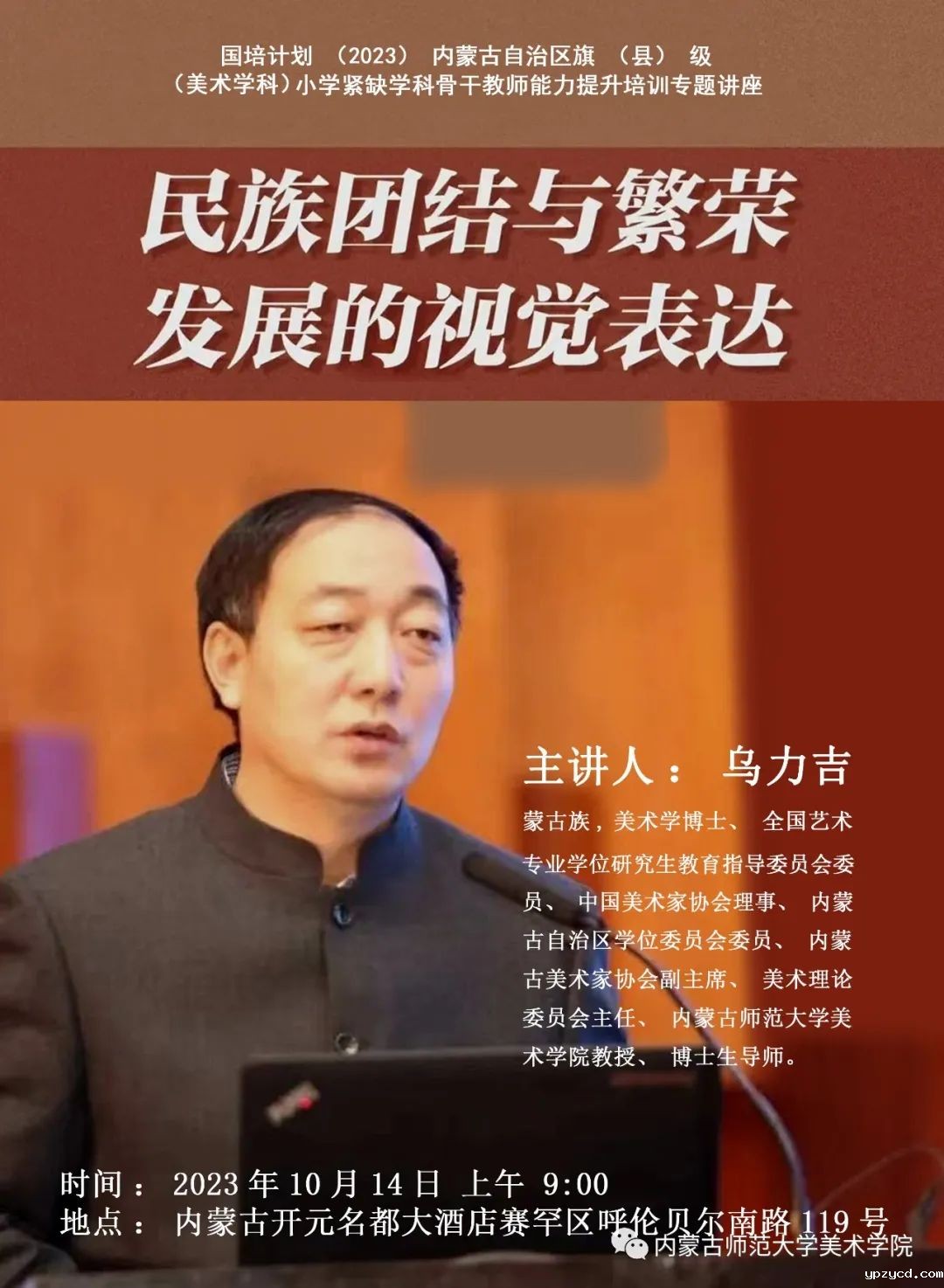 开班仪式后,特邀世界杯在线直播网站美术学院教授、博士生导师乌力吉教授担任第一场讲座的主讲人,作题为“民族团结与繁荣发展的视觉表达”专题讲座。