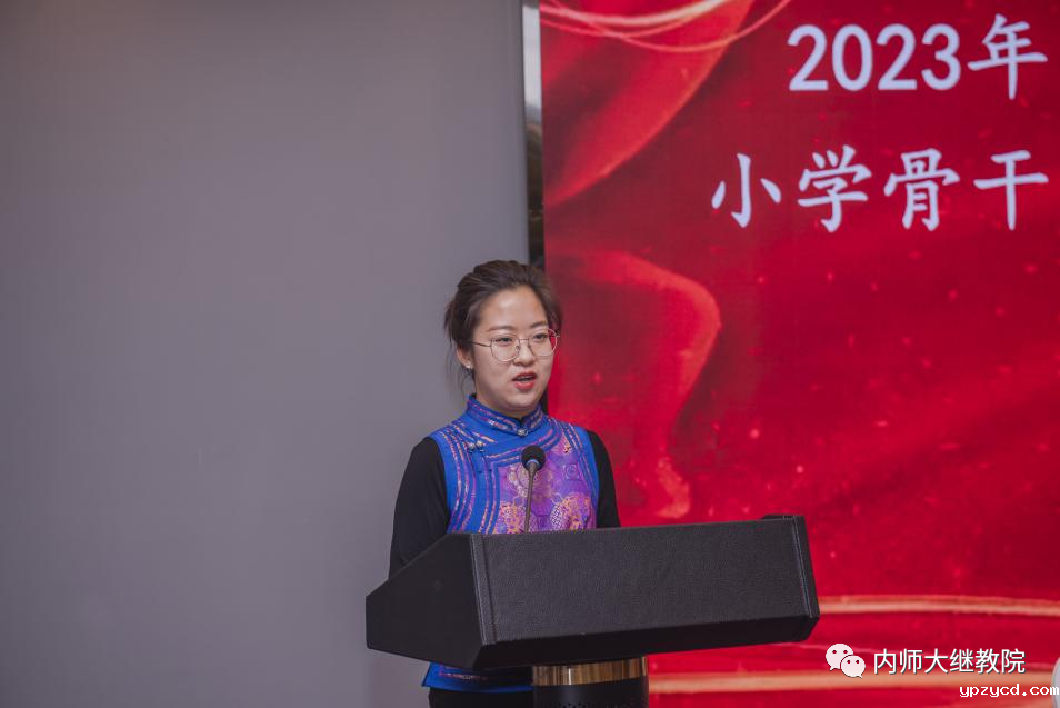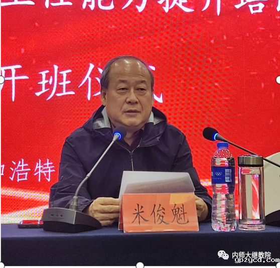 米俊魁教授发表讲话。他指出,教育是国之大计、党之大计,教师是立教之本、兴教之源。“筑梦中华,兴国必先强师。”骨干班主任是小学教师队伍的佼佼者,在基础教育课程改革和学校发展中起着带头作用。小学骨干班主任培训是提升班主任专业发展水平的重要途径,对于促进教育改革和创新至关重要。作为项目的承办方,教育学院为此次培训安排了区内集中学习、跟岗实践和区外研修访学三种学习形式。老师们不仅可以了解最新的教育理念、教育技术、课程设计、教学评价等知识和技能,还可以进校跟岗实践,通过案例分析、教学观摩、教师互动等方式,借鉴和吸收他人的教学经验和实践成果,提高自身教学水平和素质。米教授希望各位学员珍惜此次培训机会,服从安排、认真学习、深度思考,主动求教,广泛交流,共同进步,认真做好经验总结,更好地服务内蒙古自治区旗(县)级的学校和学生。