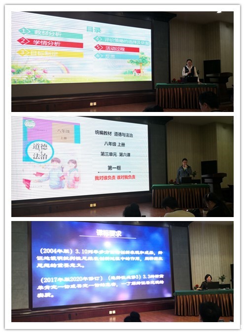 22日,北京市朝阳区教研中心教研员康利老师作了题为《育人为本,提升素养——统编教材下思想政治课教学设计》的专题讲座。讲座从教材是国家事权展开,以培养学生爱国主义情怀、社会责任感、创新精神、实践能力四个方面,来培养担当民族复兴大任的时代新人。同时还强调,让有信仰的人来讲信仰,作为思政教师,要从旗帜鲜明、润物无声、超越知识、指向观点、超越功利、指向精神、榜样示范等几方面进行教学设计。