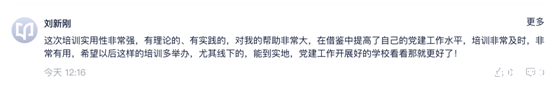 在两批总共为期10天的直播过程中,所有参训老师都积极参与每场直播的研讨及互动,针对学校党建工作及自身工作中的问题,提出了许多建设性的意见及建议,并表示培训结束后,将会结合所在学校的实际情况,将培训知识转化为实践的智慧,巩固和丰富培训成果。