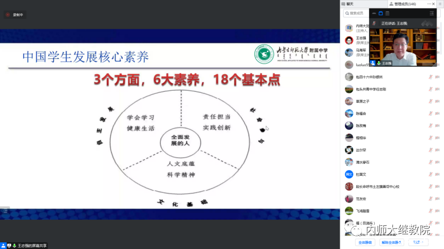 本次线上集中授课阶段于11月4日至9日进行,期间邀请了国务院特殊津贴专家、西南大学副校长陈时见教授,西北师范大学教育学院李瑾瑜教授,世界杯在线直播网站附属中学校长王志强教授,呼和浩特市回民中学党委书记、校长张威等十二位区内外知名专家、知名中学校长,以专题讲座的形式先后讲授了“习近平关于教师的重要论述解读”“义务教育阶段校长标准解读”“铸牢中华民族共同体意识”“深入学习贯彻党的二十大精神”“学校教育发展的政策逻辑与改进路径”“立德树人——新时期课程改革的新使命”“家校共育与校园安全”“赋能与成长——关于教育的一些思考和实践”“中学党建工作与业务工作的有效融合”“校园文化与校园治理”“中学教师职业行为准则与师德师风”“办‘有文化’的学校:理念、问题与策略”“国家通用语言文字核心素养”等专题。