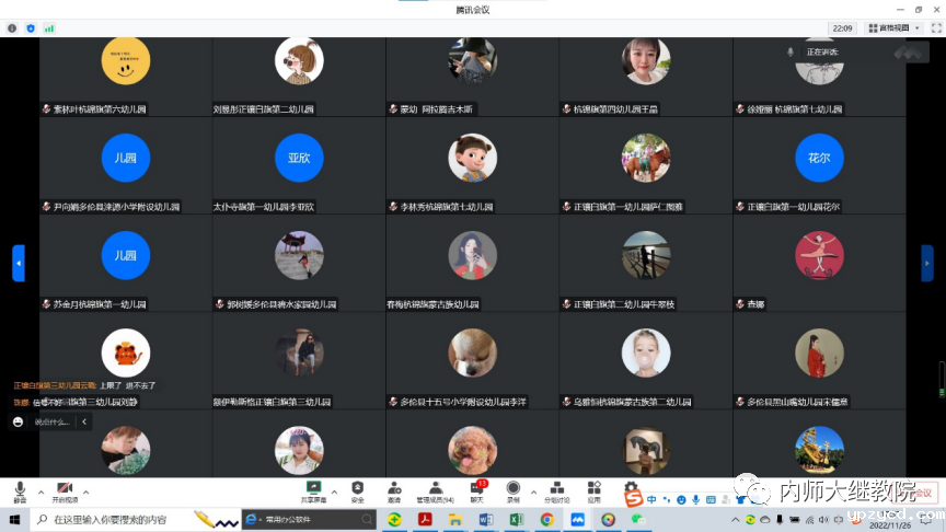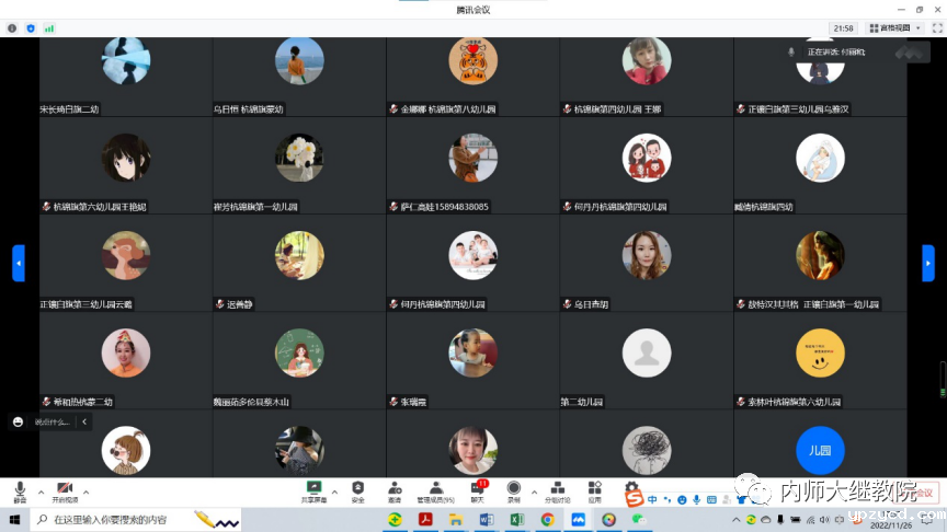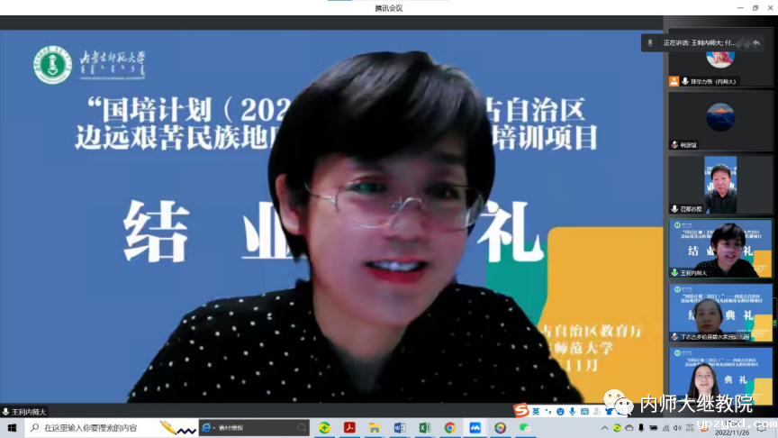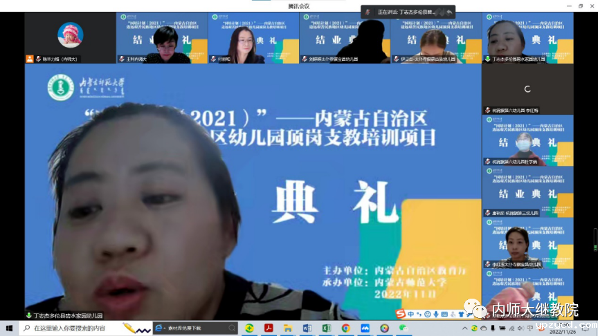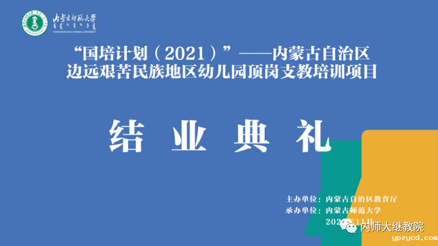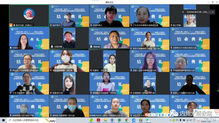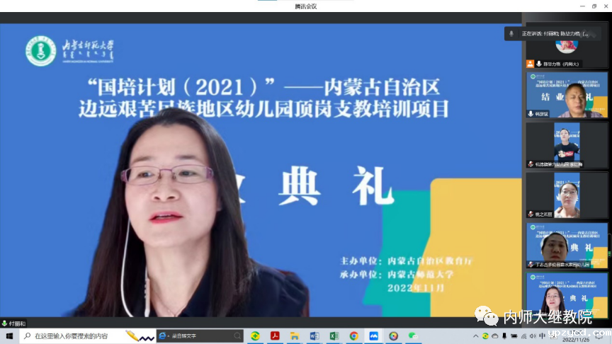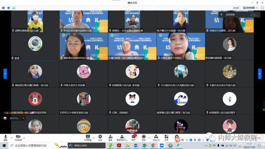11月26日下午,由自治区教育厅主办、我校继续教育学院具体组织实施的“国培计划(2021)”——内蒙古自治区边远艰苦民族地区幼儿园顶岗支教培训项目在线上举行了结业典礼,至此该项目顺利结束。继续教育学院党总支书记韩彦斌,党总支副书记、院长王利,党总支副书记、副院长刘云剑,副院长召那苏图,三位班主任高丽桃、陈毕力格、敖登以及锡林郭勒盟多伦县、太仆寺旗、镶白旗、鄂尔多斯市杭锦旗的99名幼儿园教师参加了结业典礼。