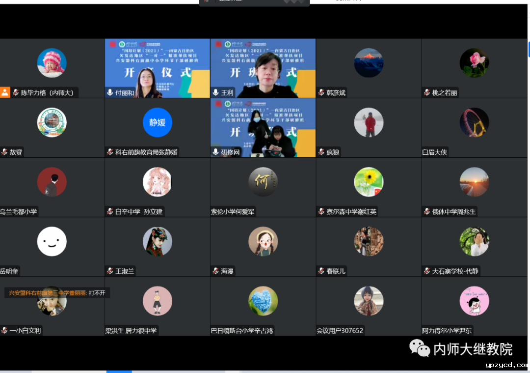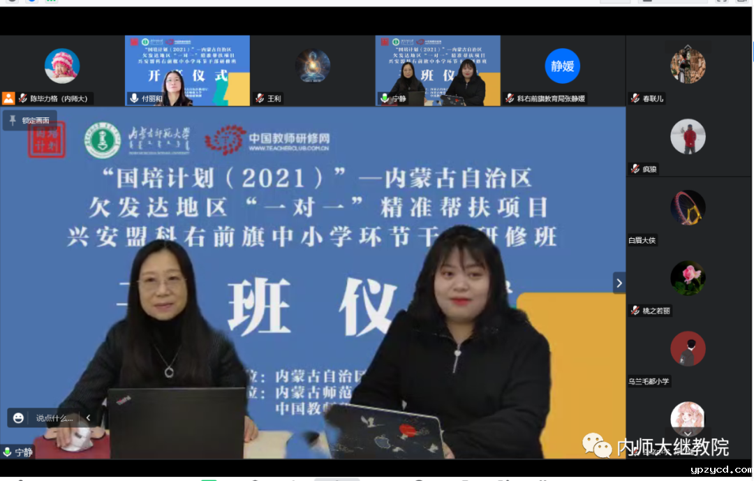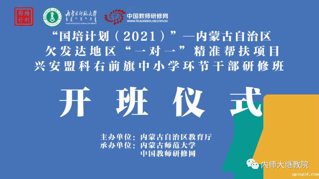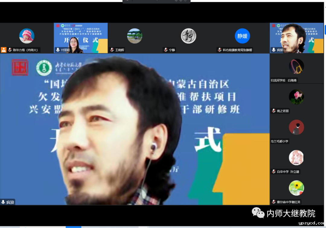 12月5日上午,由我校承办的“国培计划(2021)”——内蒙古自治区欠发达地区农村学校“一对一”精准帮扶培训项目兴安盟科右前旗中小学校环节干部研修班顺利开班。继续教育学院党总支书记韩彦斌,党总支副书记、院长王利,兴安盟科右前旗教育局副局长张静媛,中国教师研修网项目专家朱红杰、内蒙古服务中心教务主管宁静,班主任高丽桃、陈毕力格、敖登以及科右前旗60名中小学校环节干部参加了开班仪式。开班仪式由继续教育学院副院长付丽和主持。