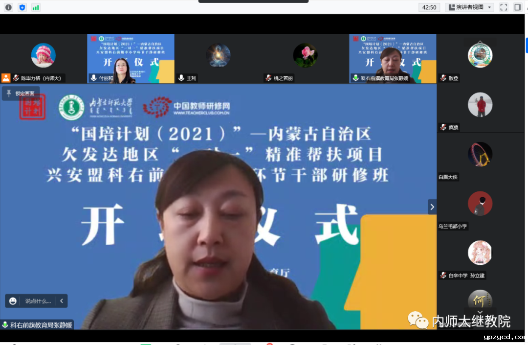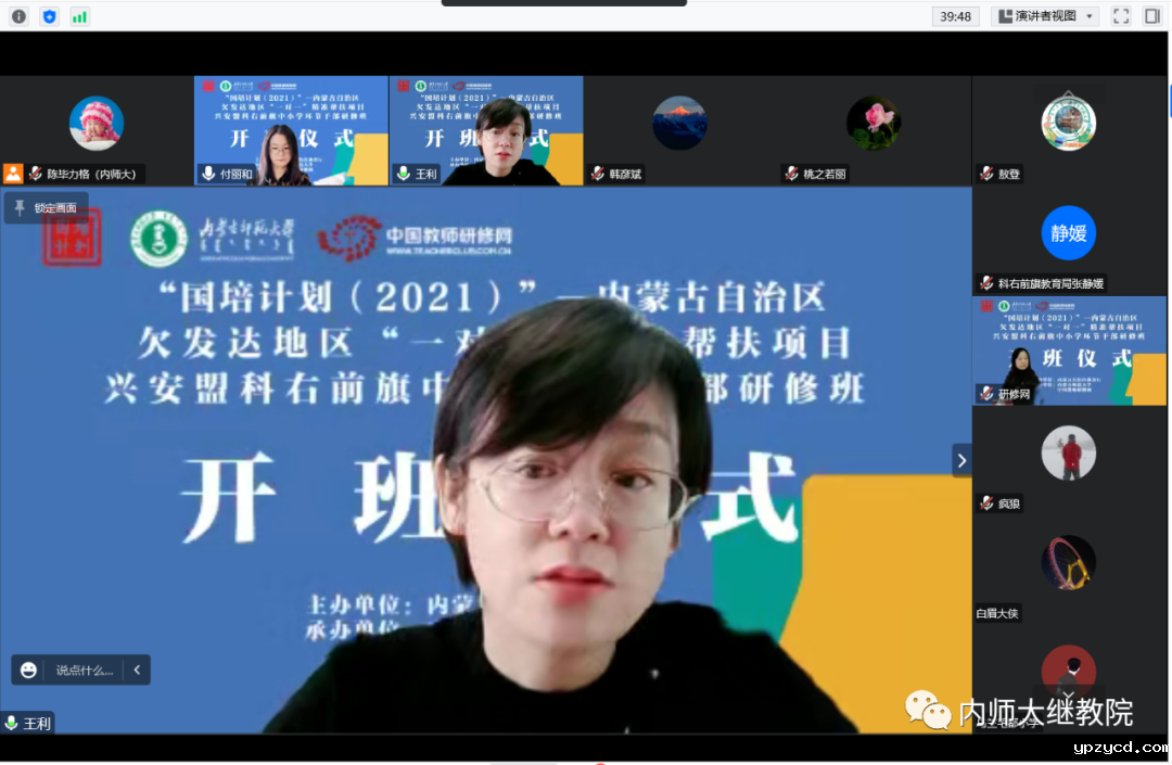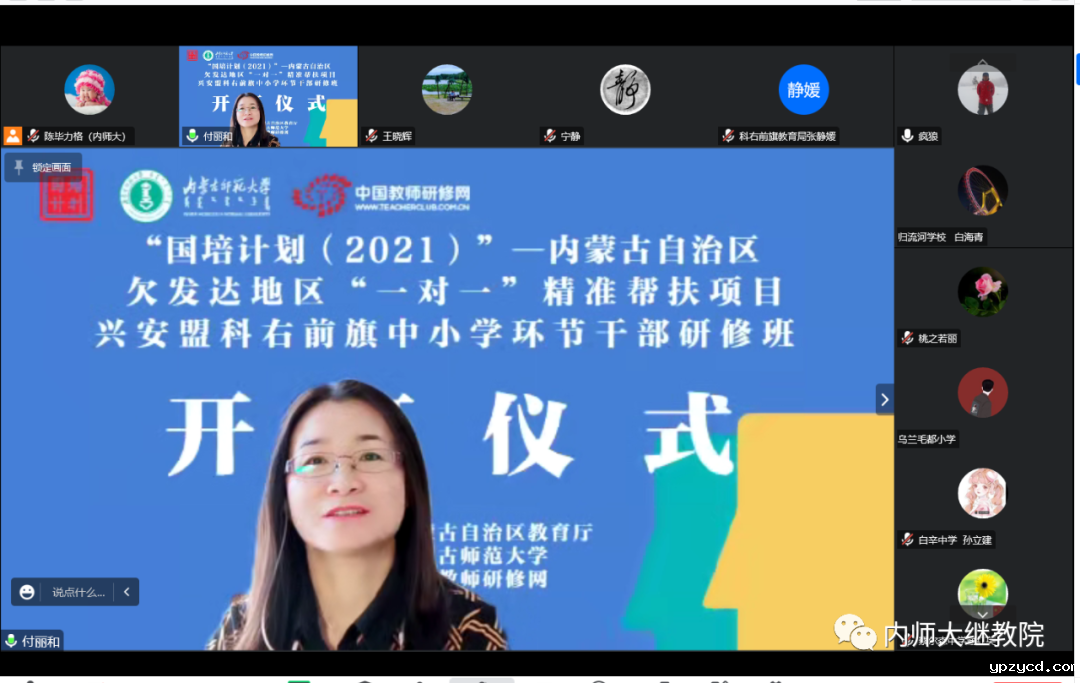 王利院长首先对给予培训大力支持的中国教师研修网和科右前旗教育局表示感谢,并对内蒙古自治区欠发达地区农村学校“一对一”精准帮扶培训项目作了简要介绍。王利表示,为确保本次培训的质量,继续教育学院协同中国教师研修网在前期充分调研的基础上,认真研制培训方案,精心遴选专家团队,为项目的高质量实施创造了条件。王利希望参训教师充分认识本次培训的重要意义,增强学习动力,全心投入学习,积极参与培训各环节,不断提升个人的专业能力和水平,切实提升线上培训的收获感,在培训结束后,能把培训所学、所得、所获运用到学校教学和管理实践中,达到学以致用,提质增效,为科右前旗基础教育的高质量发展贡献更大的力量。