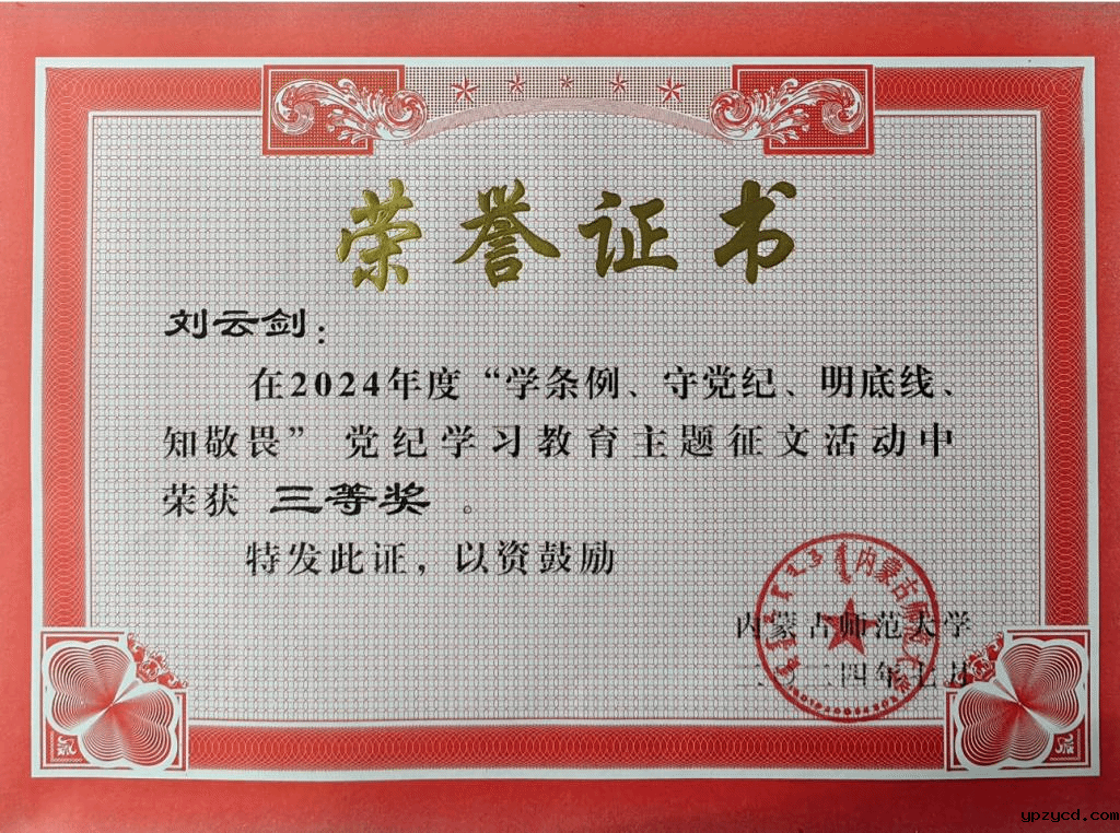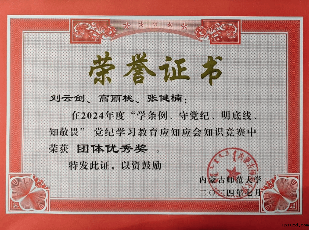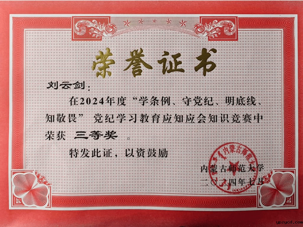 其中刘云剑获得党纪学习教育主题征文活动三等奖,党纪学习教育应知应会知识竞赛三等奖;高丽桃获得党纪学习教育应知应会知识竞赛优秀奖;刘云剑、高丽桃、张健楠共同获得党纪学习教育应知应会知识竞赛团体优秀奖。